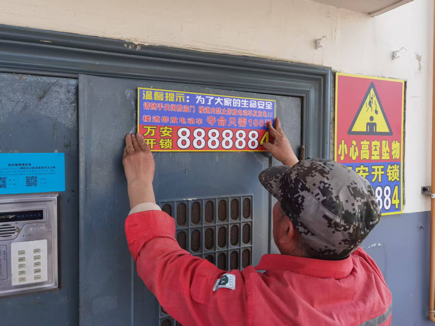 此前,小区楼道内原有提示牌因使用年限较长,出现了字迹模糊、破损老化、内容缺失等问题,不仅影响楼道整体美观,也难以充分发挥安全警示、文明提示的作用。为切实解决这一问题,清苑项目更换的新版楼道提示牌,涵盖消防安全、禁止高空抛物、请勿堵塞消防通道等多项内容。物业人员对楼栋楼道提示牌进行拆除、安装,严格把控安装位置,确保每一块提示牌都能起到良好的提示、警示效果,顺利完成全小区楼道提示牌的更换工作。