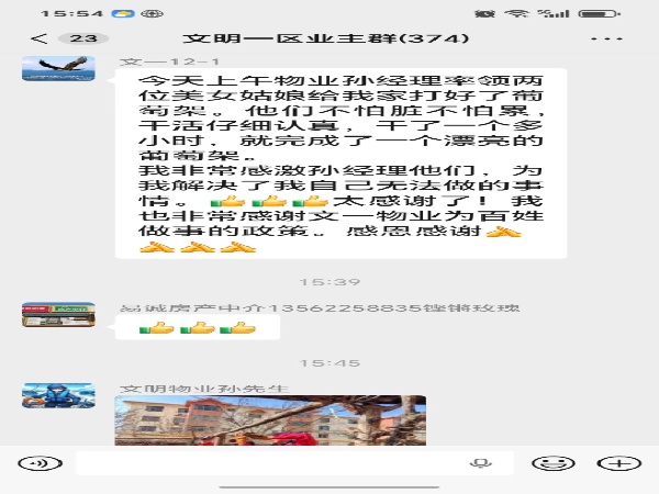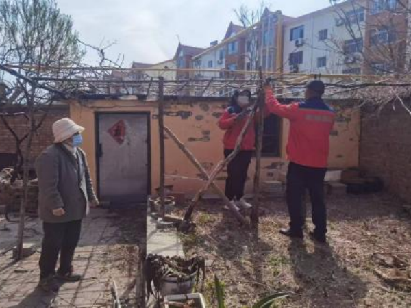 接到老人的求助后,物业工作人员孙伟第一时间带领谭延清、刘花云两名经验丰富的员工,携带铁丝、支撑杆等工具赶到老人家中。面对被狂风刮得摇摇欲坠的葡萄架,孙伟首先对现场进行全面排查,制定维修方案。谭延清和刘花云先修剪、梳理葡萄藤,将缠绕在支架上的枯枝、乱藤逐一清理,避免作业时藤条坠落伤人;随后孙伟和谭延清对变形、松动的支架进行固定,用铁丝逐点绑扎加固支撑,并额外增设一根斜向支撑杆,强化葡萄架的稳固性,确保其能抵御后续大风天气;刘花云则同步清理庭院环境,不仅将修剪下的葡萄枝、杂乱的爬山虎藤蔓、腐烂的树根全部清运干净,还彻底清除了庭院角落的杂物与枯枝,让原本杂乱的小院焕然一新。